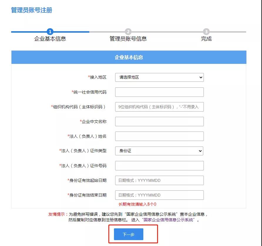 5、填寫企業(yè)基本信息后,點擊“保存企業(yè)基本信息,下一步”。