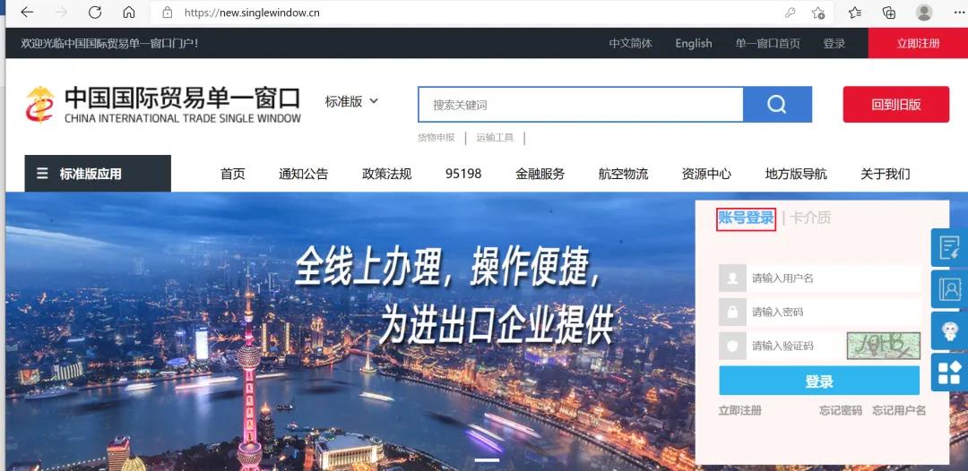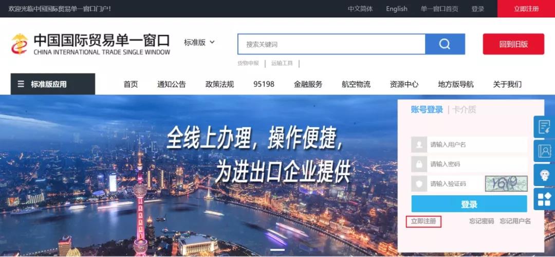 1、登錄“中國國際貿(mào)易單一窗口”標準版(網(wǎng)址:https://www.singlewindow.cn/),選擇“新版單一窗口門戶入口”,在新界面中選擇“立即注冊”。