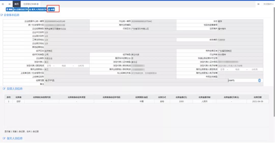 9、當以上信息均填寫完畢,便可向海關(guān)進行申報操作: